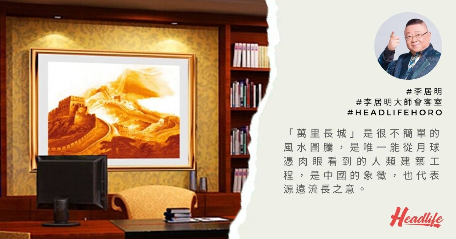 中美兩位元首的辦公室,有個共同點,都是在辦公室的靠山位擺放了家人的照片。這有兩個暗示,第一是兩位國家領導人都很重視家庭生活,第二代表他們的決策會受家人幹擾的意思。習主席還在書架上擺放他年輕時代的照片,靠山是一幅「萬里長城」國畫。「萬里長城」是一個很不簡單的風水圖騰,是唯一能從月球憑肉眼看到的人類建築工程,是中國的象徵,也代表源遠流長之意。「萬里長城」是戊土,不是人人都可以擺。以「萬里長城」作靠山,又擺放青龍國旗,可見習主席有運,此乃受萬人敬仰的風水局。